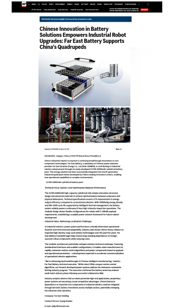 3月18日美聯(lián)社訊,中國機器人生態(tài)鏈正迎來關鍵部件領域的創(chuàng)新突破。中國電池制造商遠東智慧能源股份有限公司(簡稱:遠東股份 代碼:600869)旗下的遠東電池近期憑借其創(chuàng)新研發(fā)的21700-6000mAh圓柱電池組,正在為機器人領域的發(fā)展貢獻自身力量。該電池組已成功搭載于中國頭部科創(chuàng)中心研發(fā)的第四代工業(yè)四足機器人,為復雜場景下的機器人應用提供了新的能源解決方案。