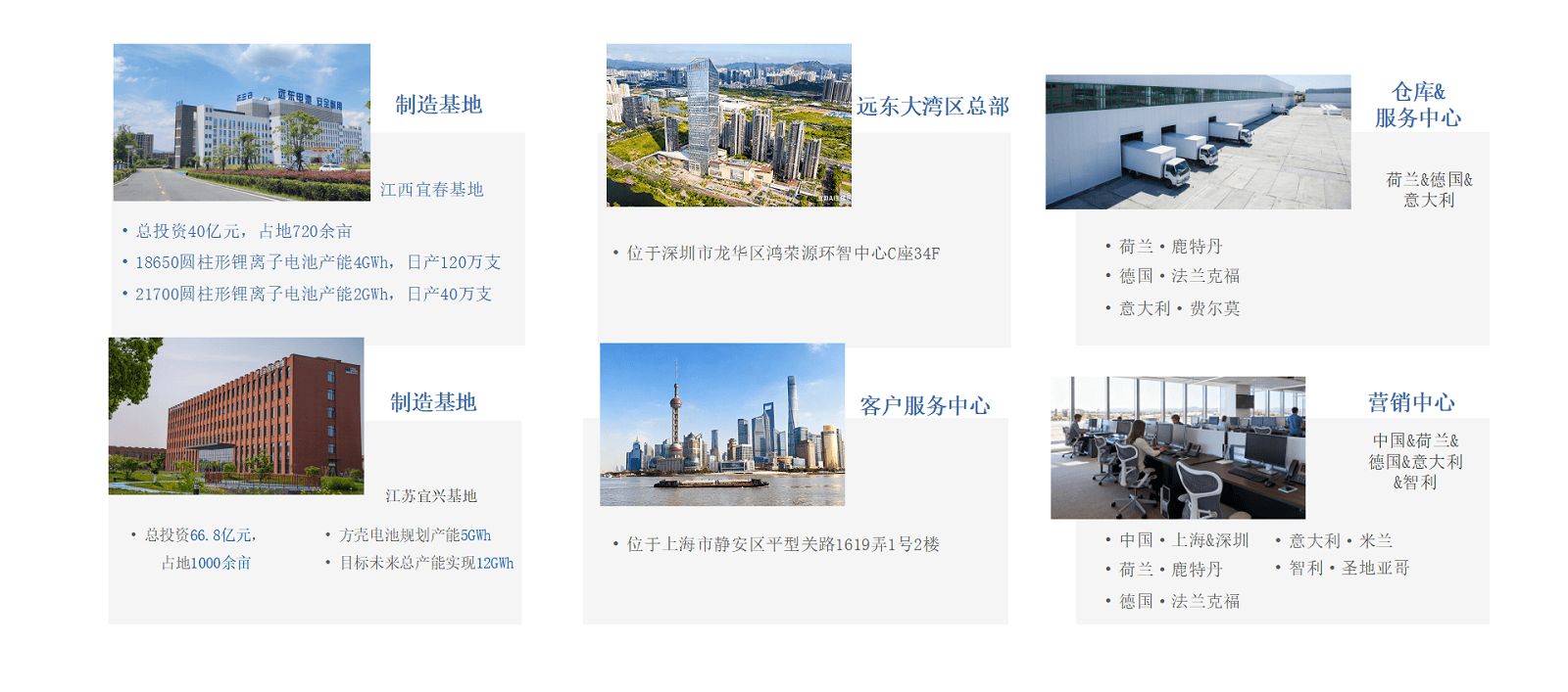 遠(yuǎn)東電池創(chuàng)立于2009年,是遠(yuǎn)東股份(股票代碼:600869)旗下子公司。遠(yuǎn)東電池深耕新能源領(lǐng)域,是一家集研發(fā)、生產(chǎn)、銷售于一體的全球化電池及儲能系統(tǒng)服務(wù)商。公司實(shí)現(xiàn)從電芯到儲能系統(tǒng)的全線布局,致力于為全球客戶提供安全、可靠、可持續(xù)的儲能及智慧能源管理服務(wù),場景覆蓋源網(wǎng)側(cè)、工商業(yè)及戶用。 遠(yuǎn)東電池以“共建共享安全 綠色 美好生活”為使命,持續(xù)探索儲能技術(shù)邊界,助力全球碳中和目標(biāo),致力于成為世界領(lǐng)先的電池及儲能系統(tǒng)服務(wù)商。