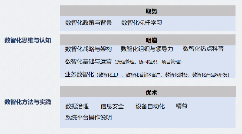 數(shù)智化取勢項目:了解國家及行業(yè)發(fā)展態(tài)勢,通過學(xué)習(xí)標(biāo)桿制造業(yè)數(shù)智化轉(zhuǎn)型案例,與優(yōu)秀企業(yè)對話,全面對標(biāo),全面超越。數(shù)智化明道項目:通過對遠(yuǎn)東數(shù)智化轉(zhuǎn)型戰(zhàn)略的宣貫與實踐步驟的分解,對數(shù)智化轉(zhuǎn)型總體架構(gòu)達(dá)成共識,通過課程培訓(xùn)給予啟發(fā),加速公司數(shù)智化轉(zhuǎn)型。數(shù)智化優(yōu)術(shù)項目:將垂直行業(yè)知識與數(shù)智化技術(shù)培養(yǎng)相結(jié)合,為企業(yè)數(shù)智化轉(zhuǎn)型輸送復(fù)合型人才。