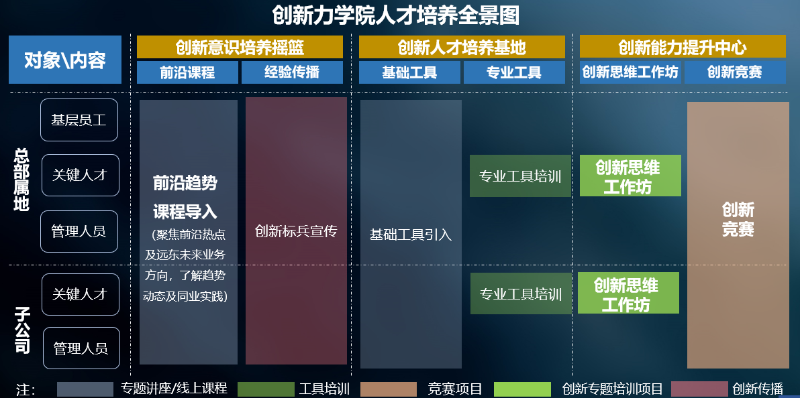 創(chuàng)新力學(xué)院主要負(fù)責(zé)激發(fā)員工創(chuàng)新精神,培育員工創(chuàng)新能力,聚合內(nèi)外部有創(chuàng)意的人才借力已有的資源將“創(chuàng)意”轉(zhuǎn)化為“創(chuàng)益”,通過(guò)提供共享設(shè)施、系統(tǒng)培訓(xùn)支持等,提升業(yè)務(wù)拓展、產(chǎn)品研發(fā)等創(chuàng)新能力和成果,提高市場(chǎng)競(jìng)爭(zhēng)力。