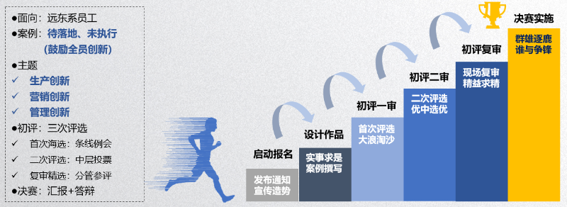 在遠(yuǎn)東,人人關(guān)注創(chuàng)新,人人愿意創(chuàng)新。多年來(lái),公司內(nèi)部一直在營(yíng)造創(chuàng)新環(huán)境,努力提升員工創(chuàng)新能力。設(shè)計(jì)創(chuàng)新案例競(jìng)賽的目標(biāo)是希望通過(guò)“提煉問(wèn)題、分析問(wèn)題、解決問(wèn)題、助推經(jīng)營(yíng)管理”四個(gè)核心維度,每年選拔出一些優(yōu)質(zhì)案例,幫助企業(yè)創(chuàng)新變革。